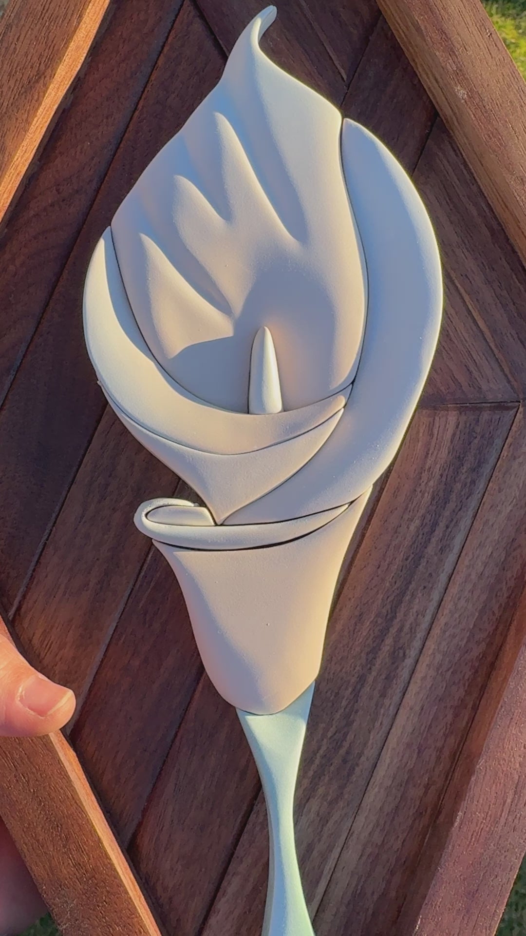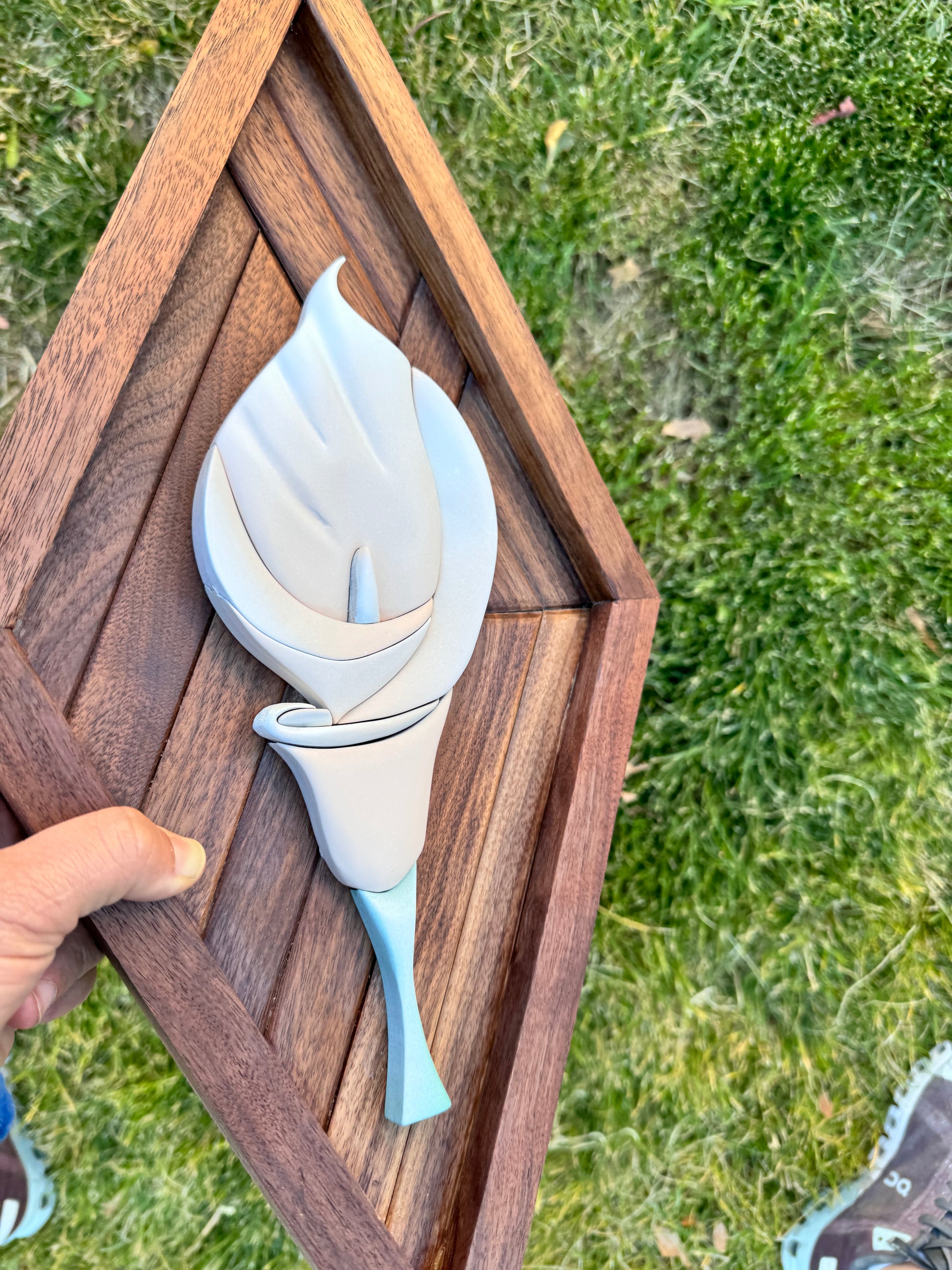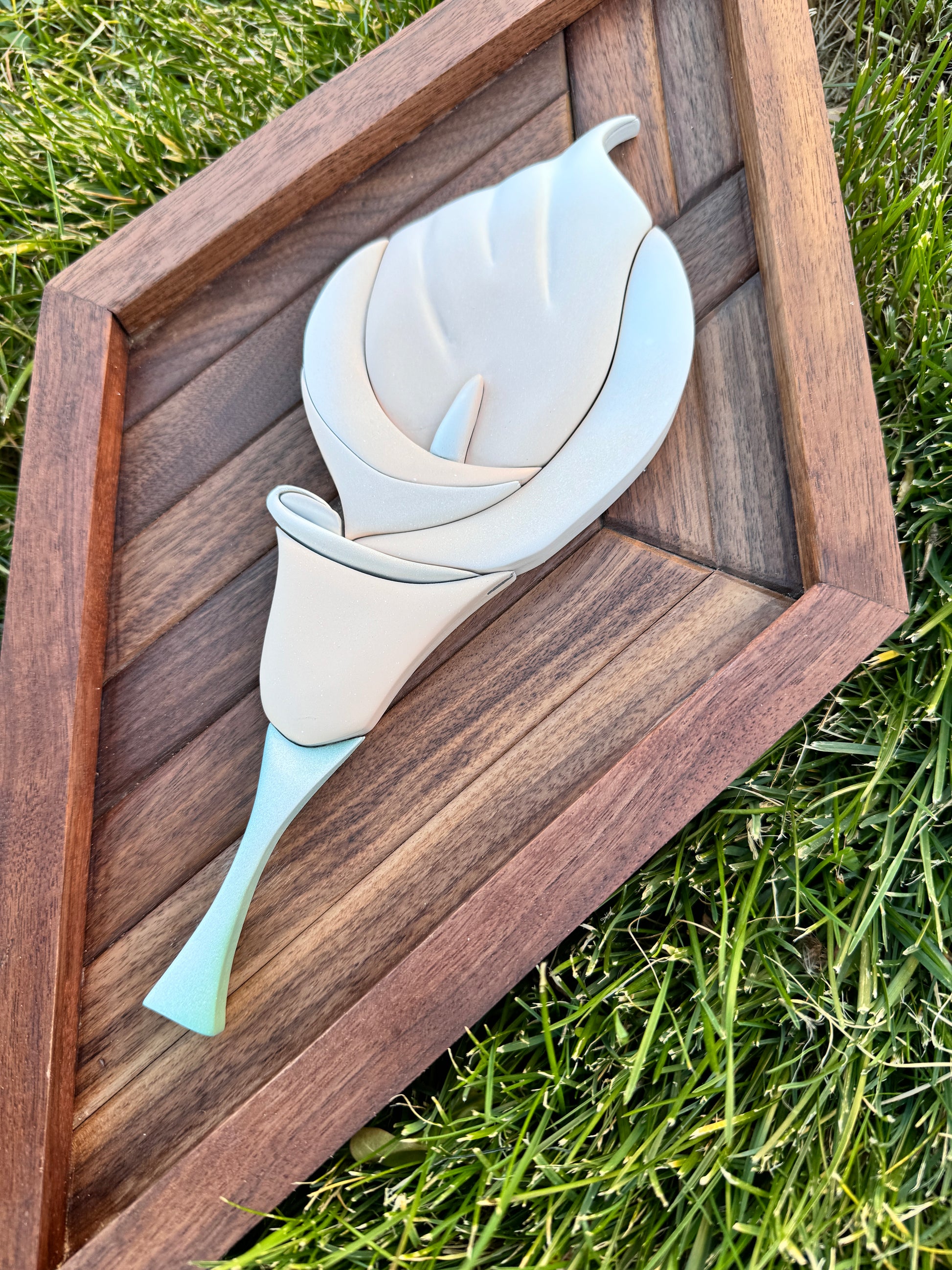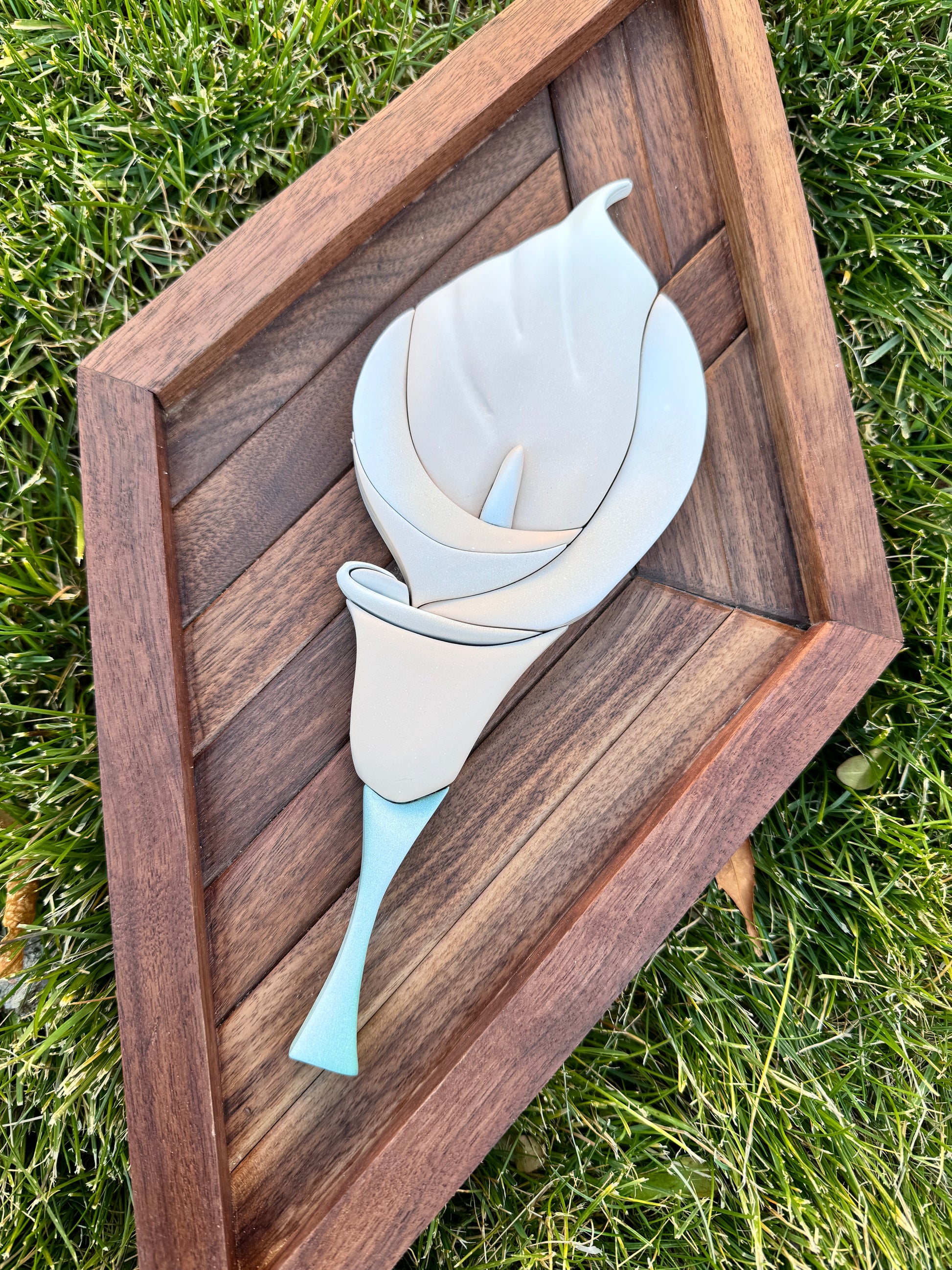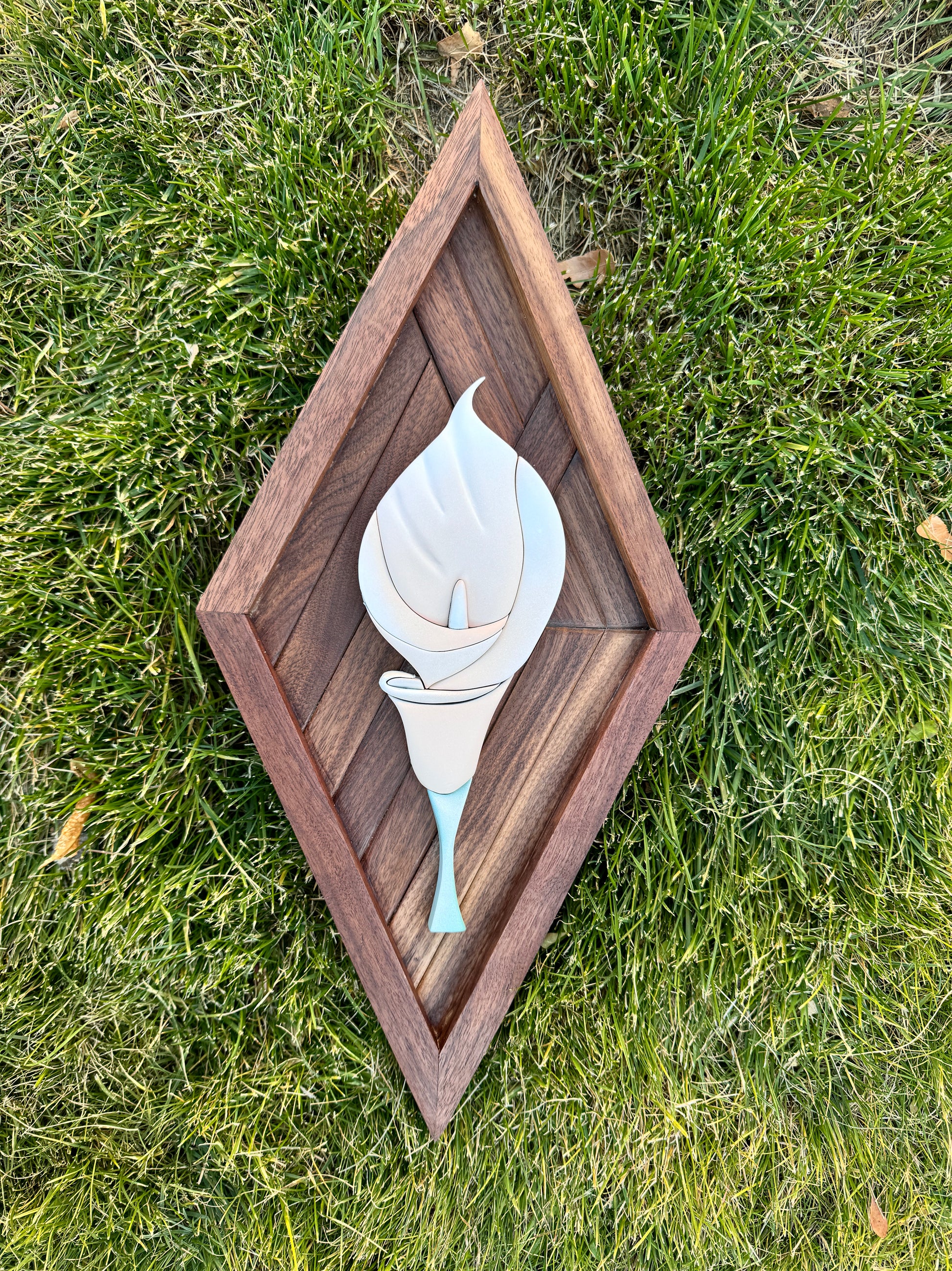This unique diamond backer is made from strips of walnut and framed with solid walnut. This is a hand drawn lily then cut on my laser. Hand carved to add dimension and realistic characteristic. Nude colors to complement the wood. This piece comes with hanging hardware.