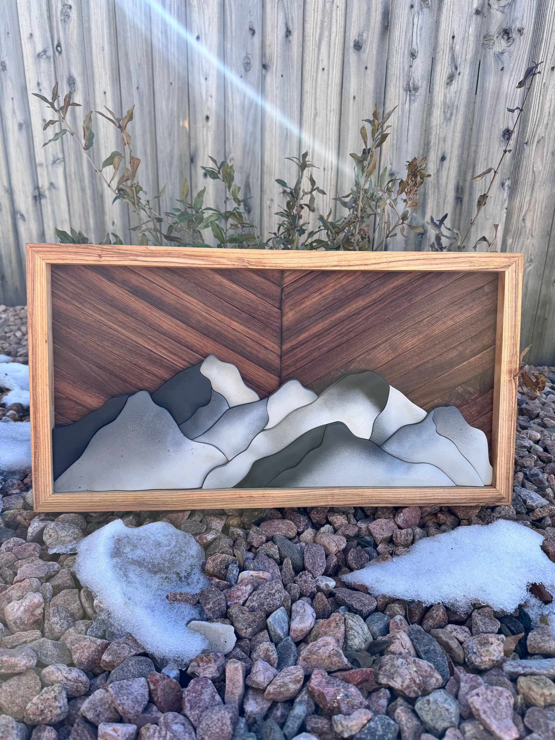 Simple but unique. This unique backer is made from strips of walnut. This is a hand drawn mountain scene, then cut on my laser. Hand carved to add dimension and realistic characteristic. Black & whites colors to complement the wood. This piece comes with hanging hardware.