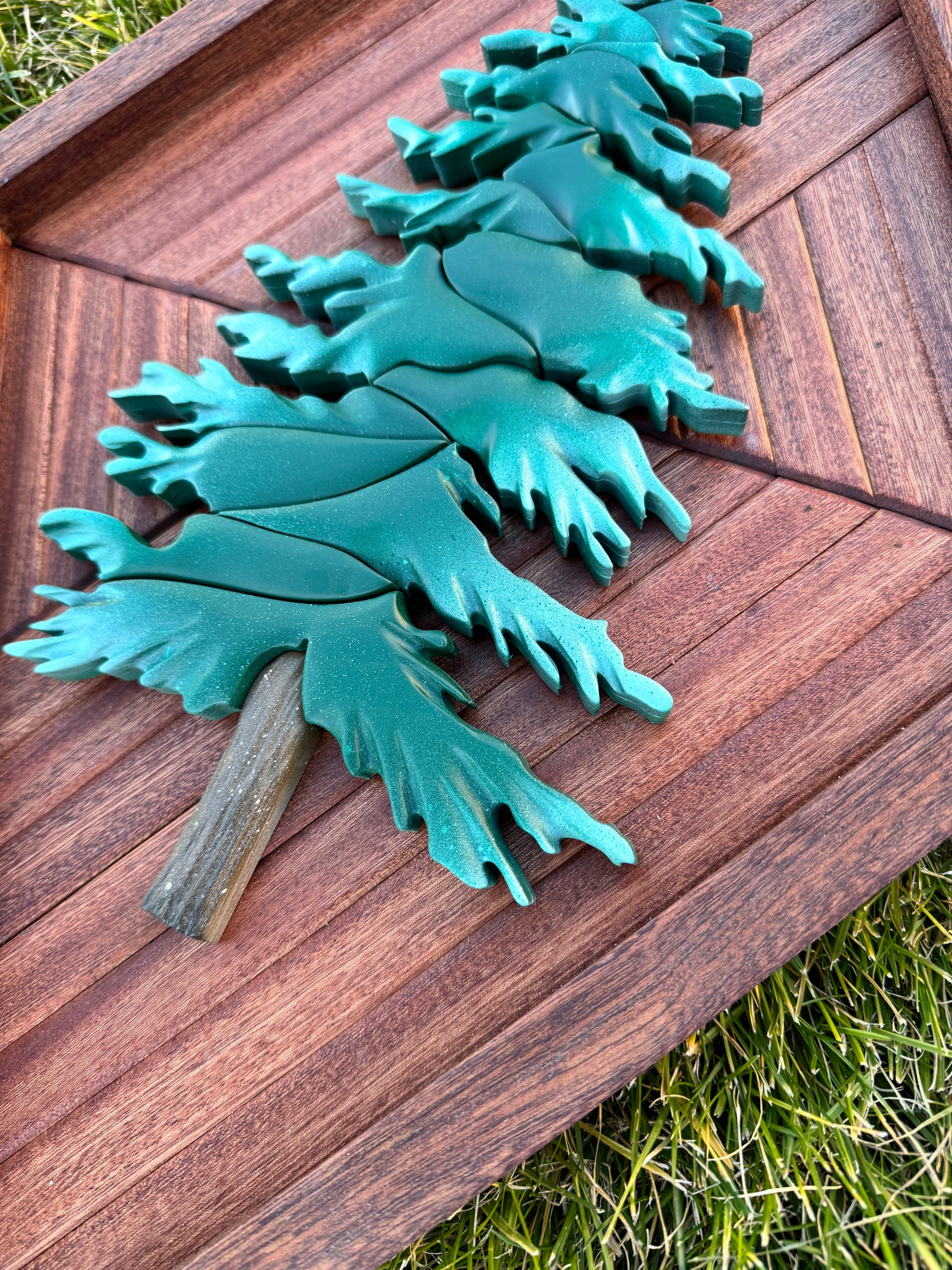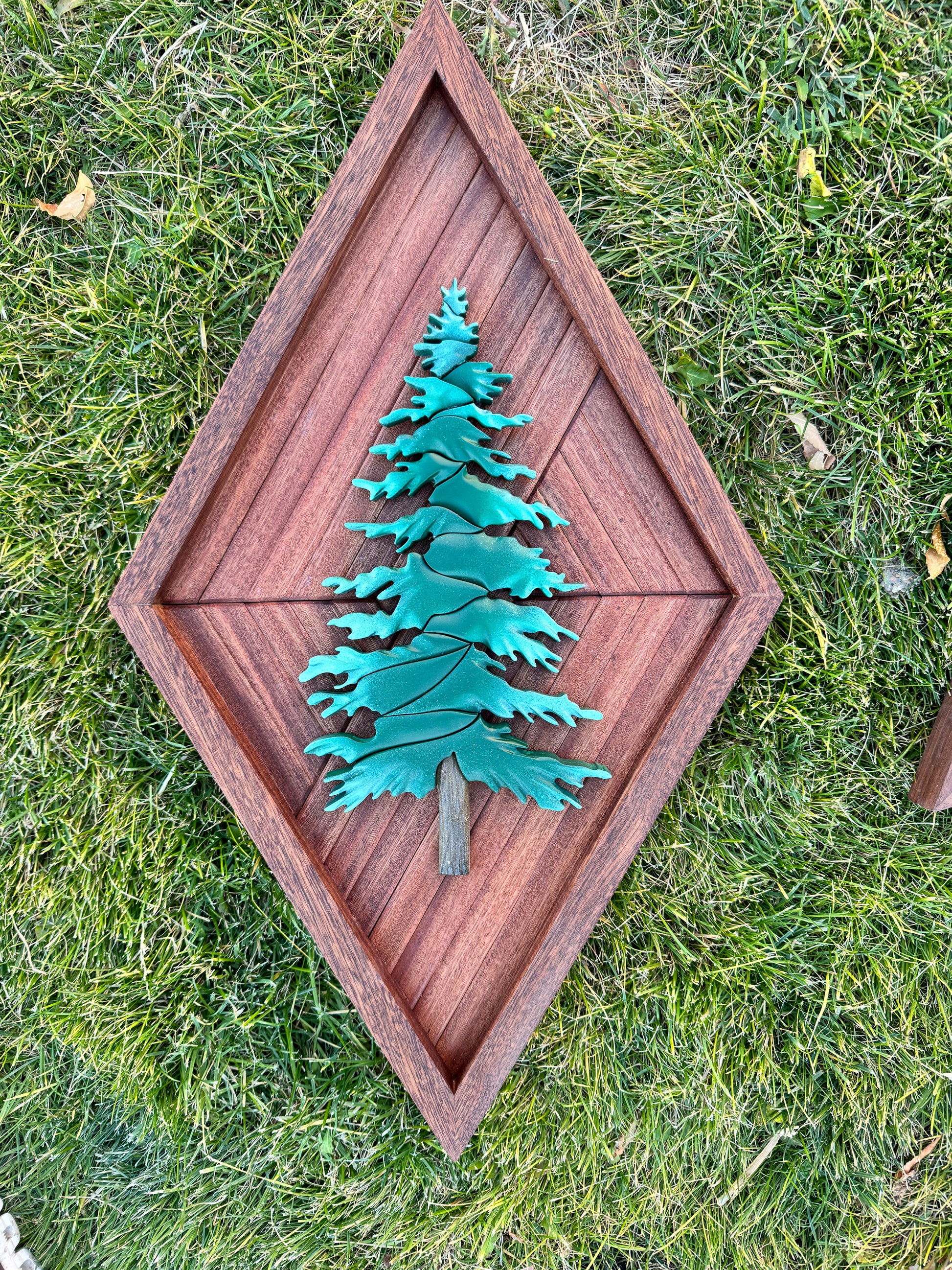 This unique diamond backer is made from strips of walnut and framed with solid walnut. This is a hand drawn pine tree then cut on my laser. Hand carved to add dimension and realistic characteristic. This piece comes with hanging hardware.