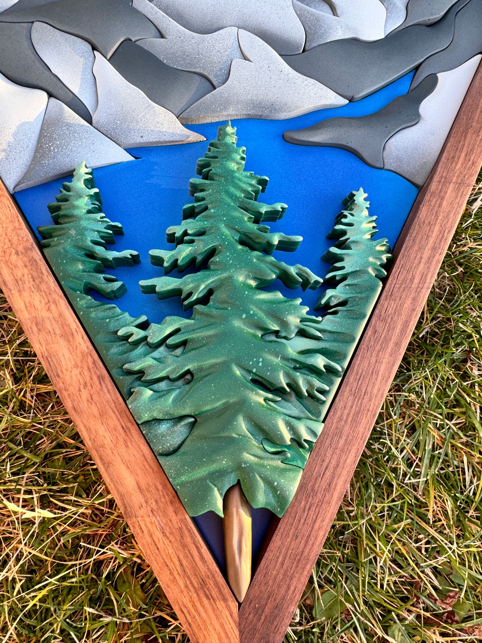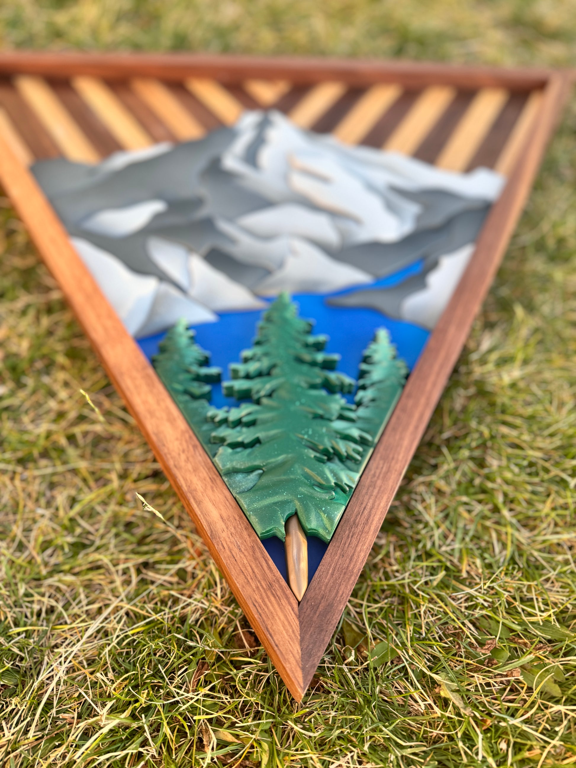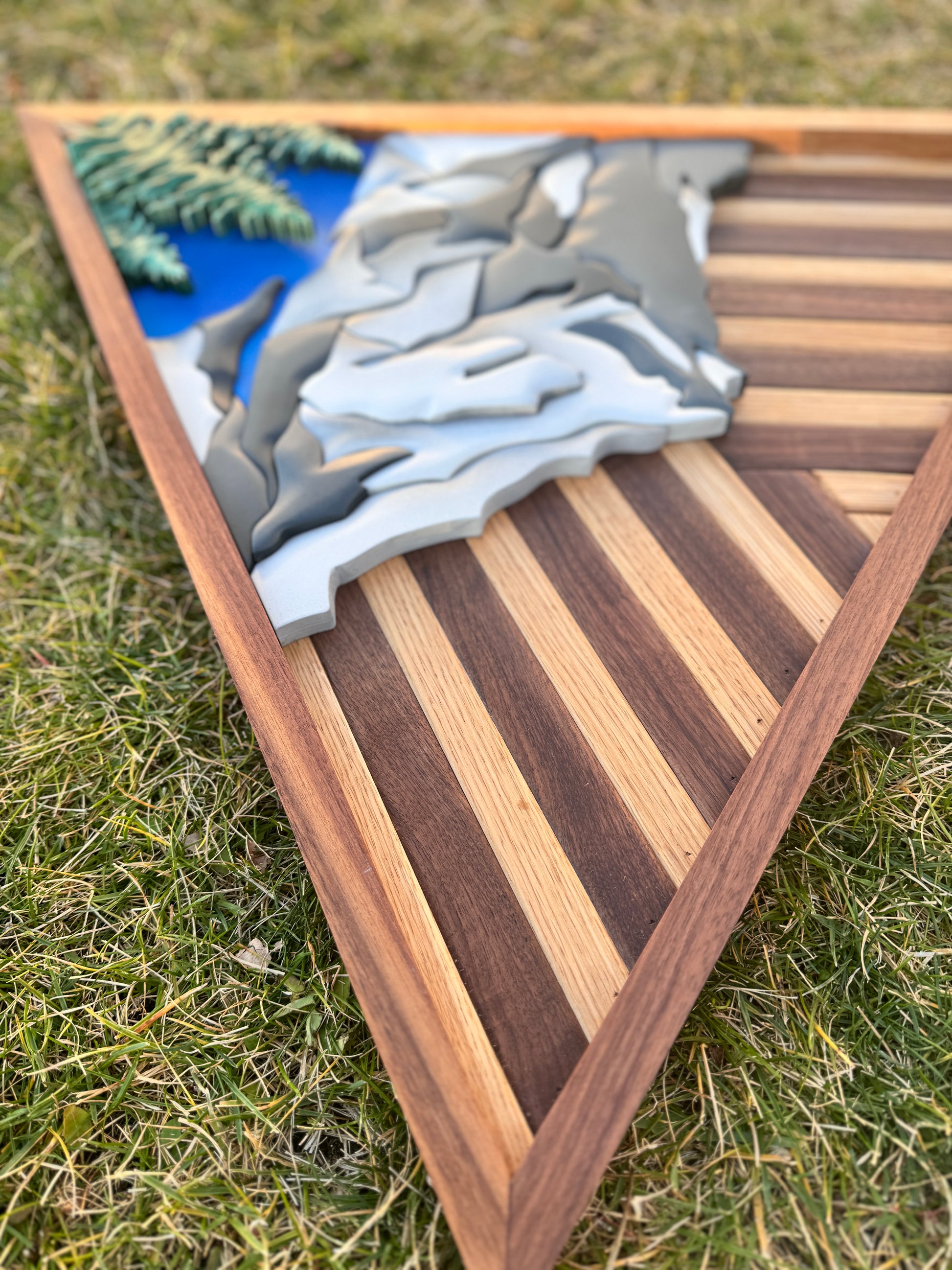 This unique triangle shaped backer is made from strips of walnut and white oak, framed with solid walnut. This is a hand drawn scenery then cut on my laser. Hand carved to add dimension and realistic characteristic. This piece comes with hanging hardware.