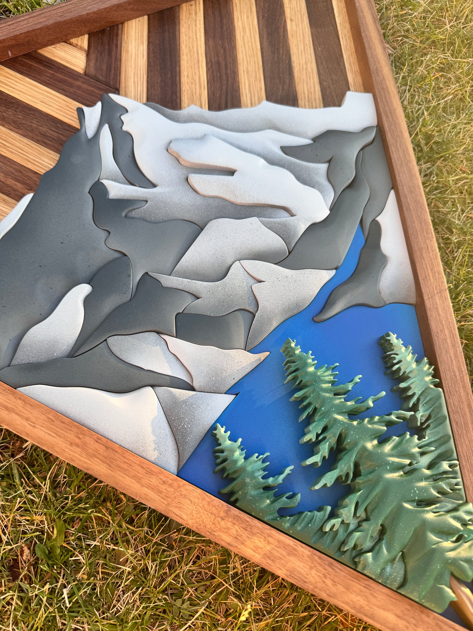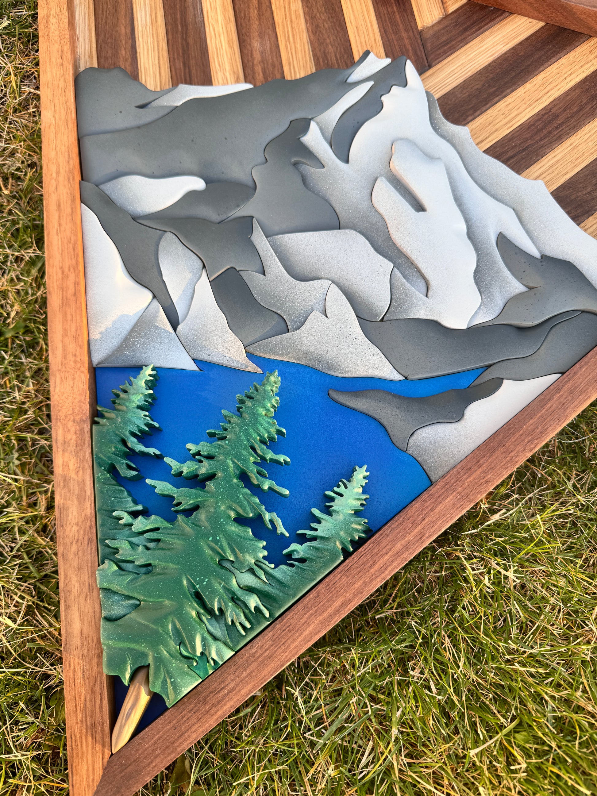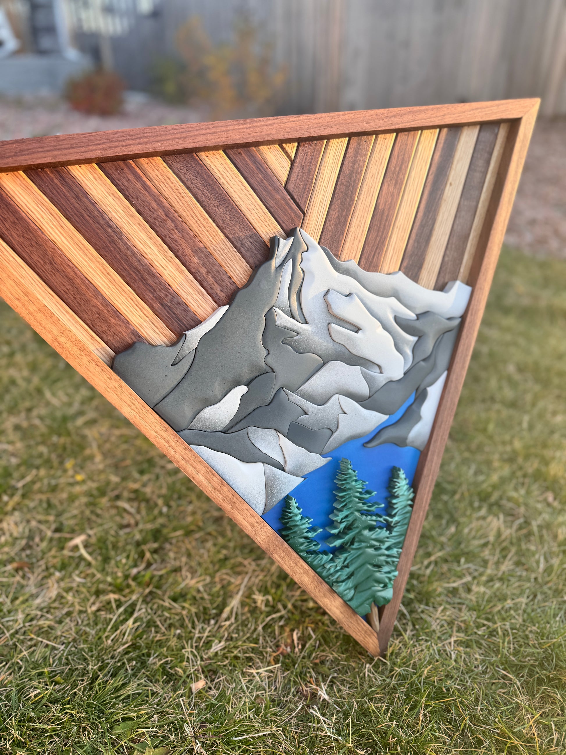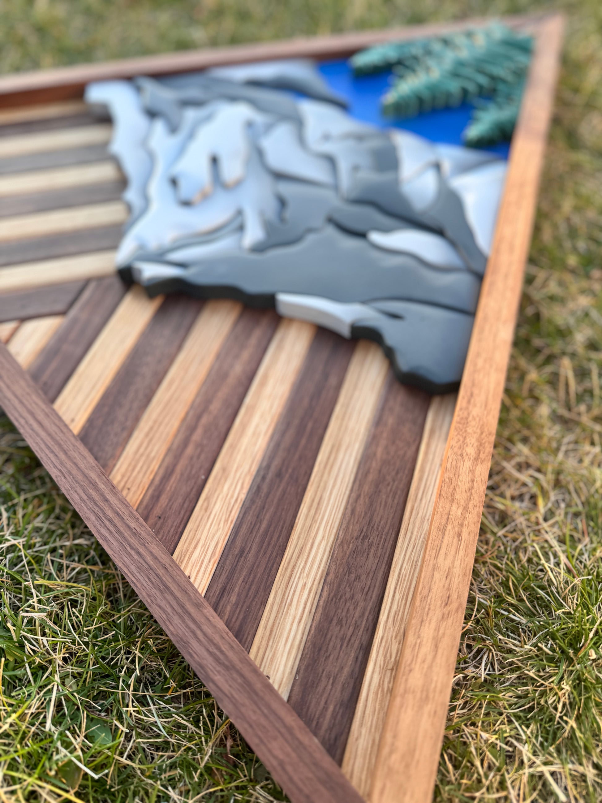 This unique triangle shaped backer is made from strips of walnut and white oak, framed with solid walnut. This is a hand drawn scenery then cut on my laser. Hand carved to add dimension and realistic characteristic. This piece comes with hanging hardware.