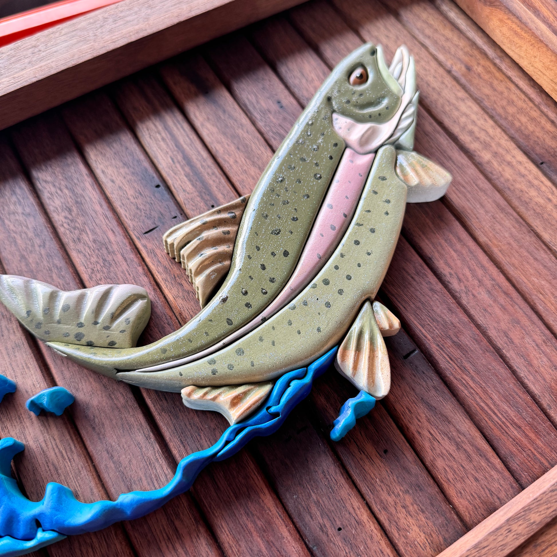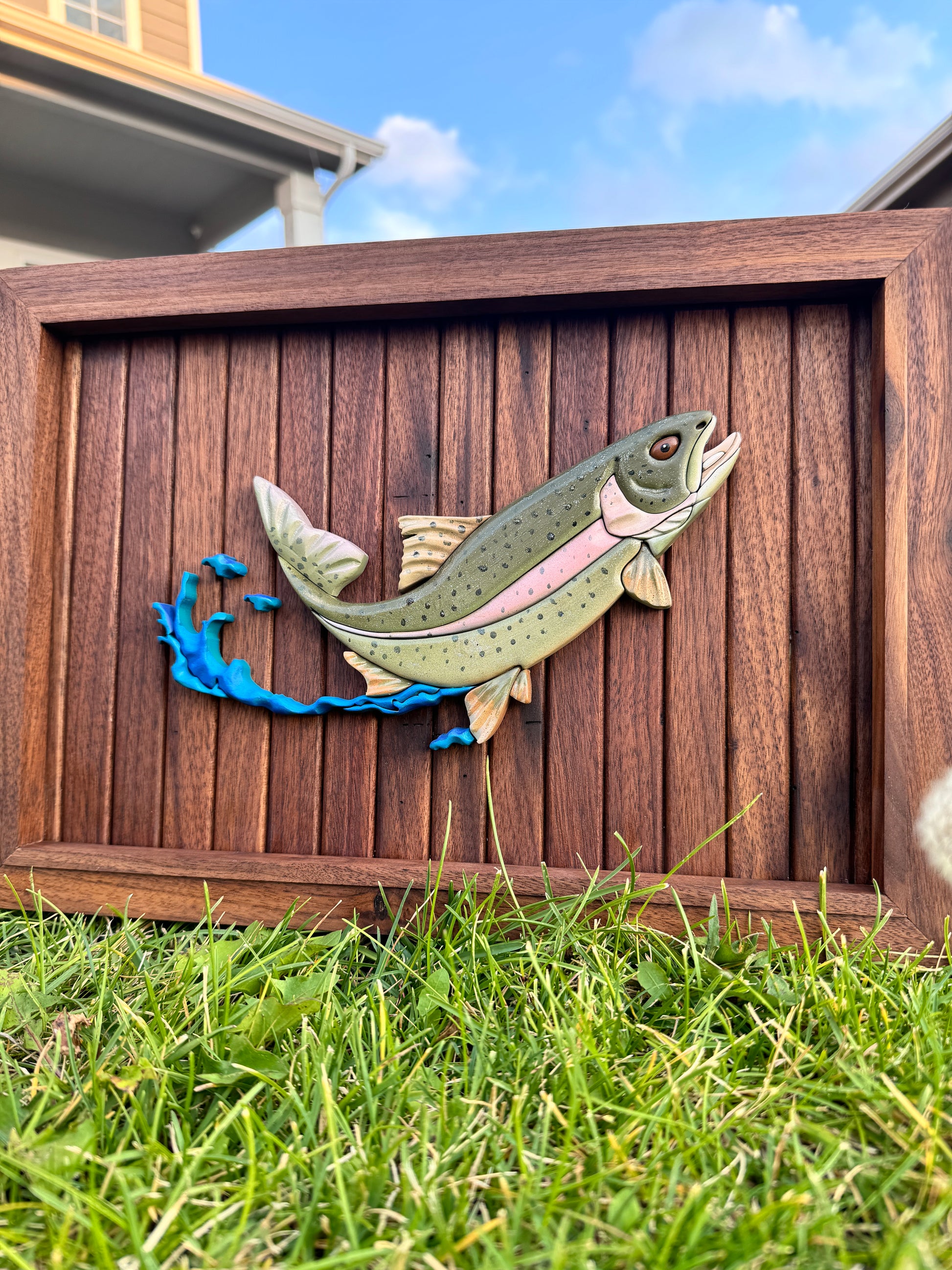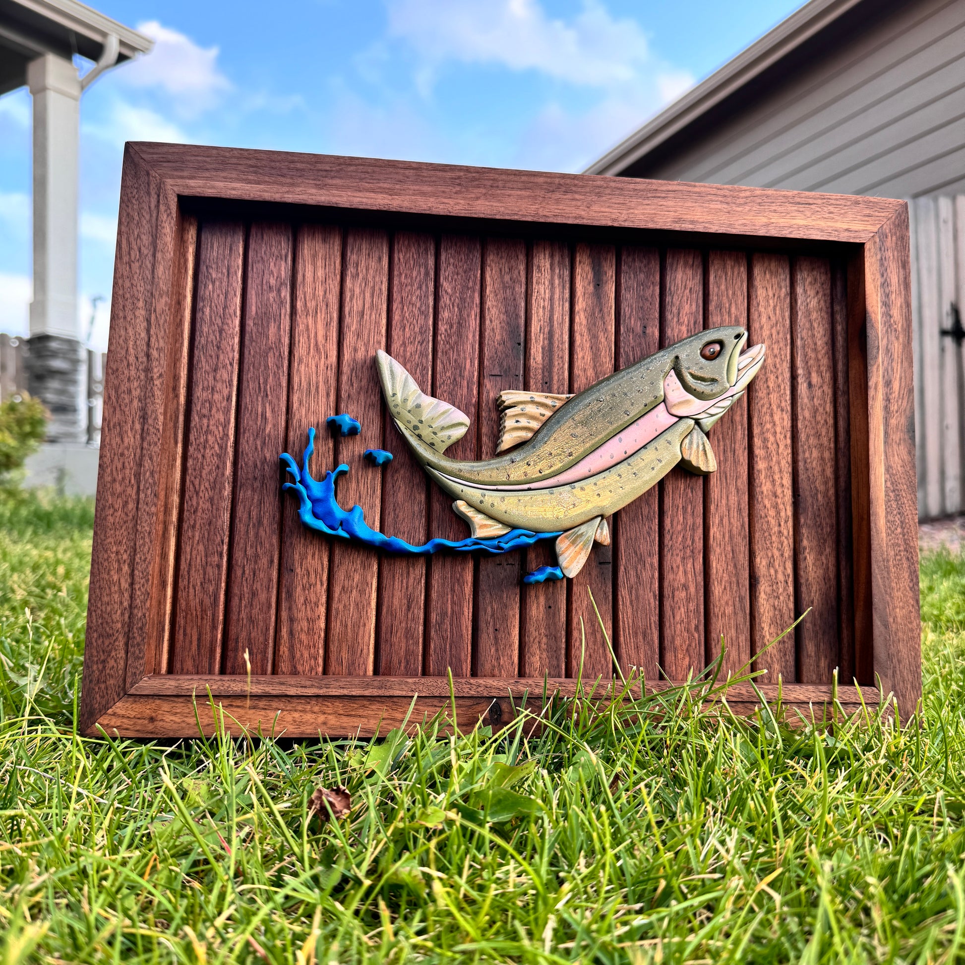 This backer is made from strips of walnut and framed with solid walnut. This is a hand drawn trout fish then cut on my laser. Hand carved to add dimension and realistic characteristic. This piece is perfect for a desk, office, or man cave. Comes with hanging hardware.